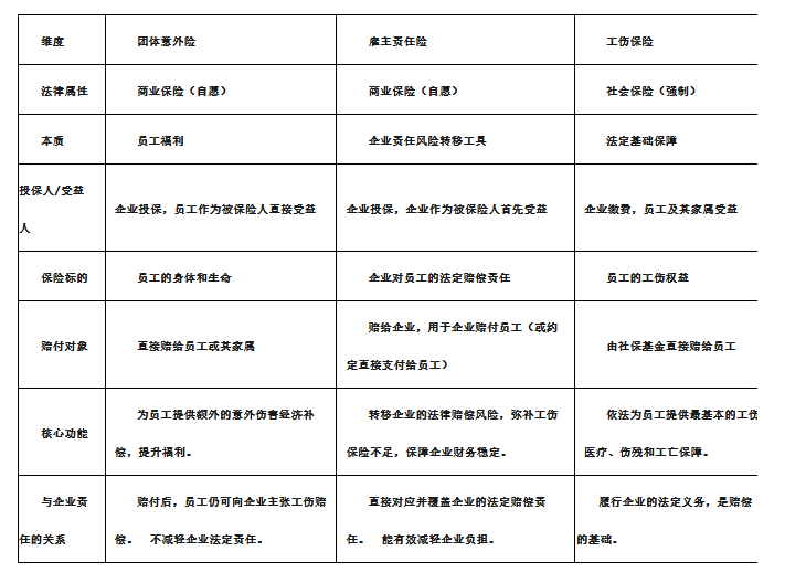 综上所述,一个完整的企业用工风险保障体系应像一座金字塔。其中,工伤保险是基石(法定强制),雇主责任险是主体(风险转移核心),团体意外险是有益补充(员工福利)。
